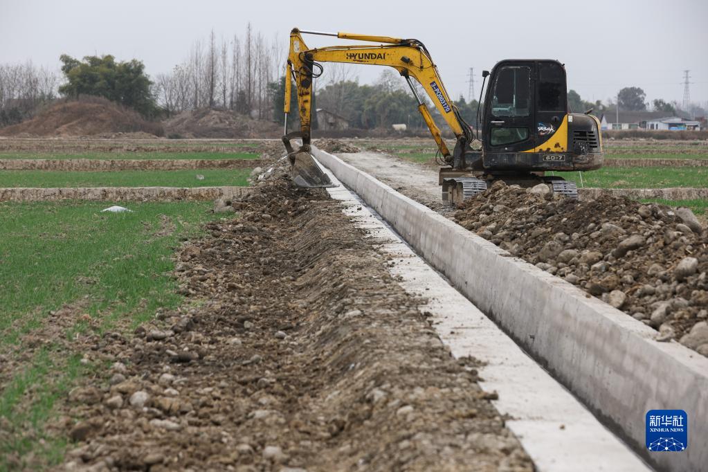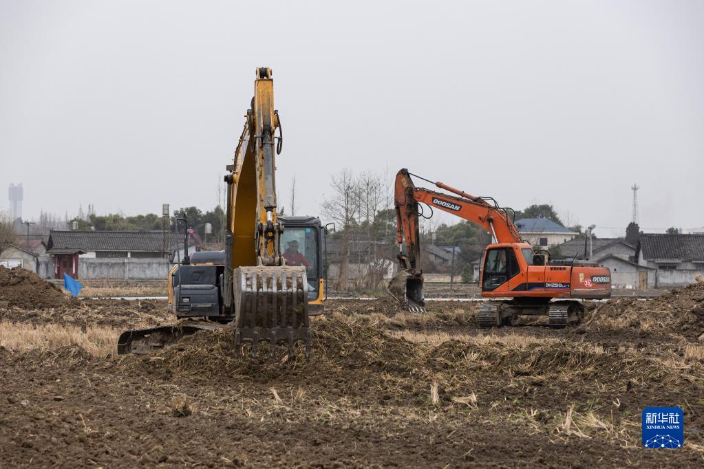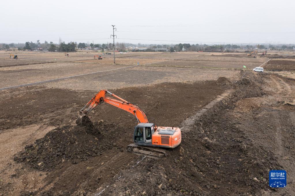 1月14日,在绵竹市孝德镇清道社区,挖掘机在整治农田。 冬闲时节,四川省绵竹市抓紧建设2022年高标准农田建设项目。该项目涉及绵竹市4个镇(街道)11个行政村(社区)共2.1万亩,新建、整治排灌渠系近120公里,新建、整治田间道60余公里,于2022年10月开工,预计2023年5月底全面完成主体工程建设。 新华社记者 江宏景 摄