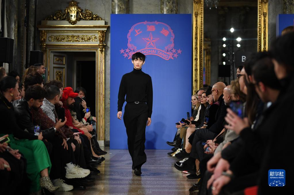 1月14日,一名模特在意大利米兰男装周上展示上海滩品牌时装。