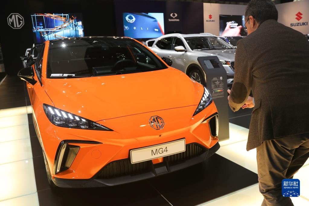 1月13日,一名男子在比利时布鲁塞尔车展媒体开放日上拍摄名爵4电动汽车。 第100届比利时布鲁塞尔车展13日迎来媒体开放日,这是该展览疫情后首次线下举办。比亚迪、上汽、北汽、东风小康、赛力斯等中国品牌携高端车型登陆车展,其中多款电动汽车备受瞩目。 新华社记者 郑焕松 摄