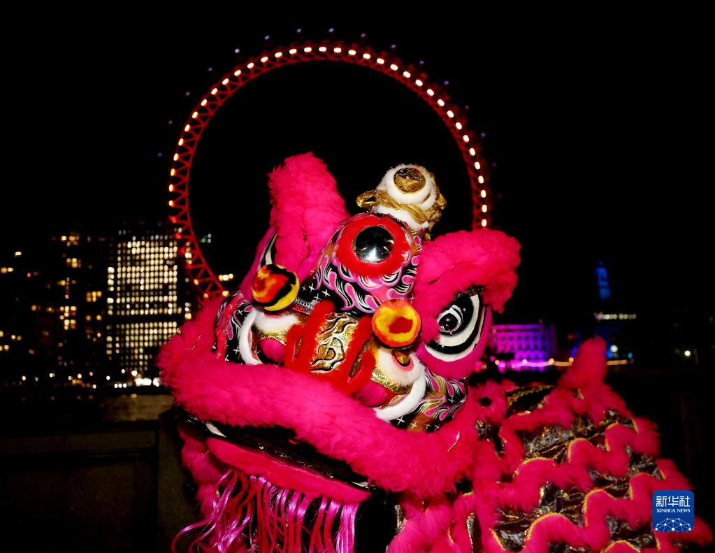 1月13日,在英国伦敦,演员在亮起红色灯光的“伦敦眼”前表演舞狮。 当晚,英国伦敦地标建筑、巨型摩天轮“伦敦眼”亮起红色灯光,迎接中国农历新年的到来。 新华社记者 李颖 摄