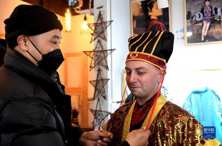 1月13日,在洛阳市洛邑古城一家汉服体验馆内,乔丹试穿汉服。 新华社记者 郝源 摄
