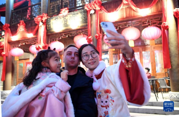 1月13日,乔丹一家在洛阳市洛邑古城内自拍留念。 新华社记者 郝源 摄