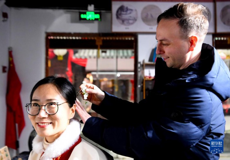 1月13日,在洛阳市洛邑古城一家非遗体验馆内,乔丹为妻子范梦佳佩戴簪花。 新华社记者 郝源 摄