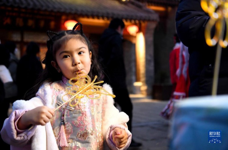 1月13日,女儿艾润在洛阳市洛邑古城内游玩。 新华社记者 郝源 摄 |