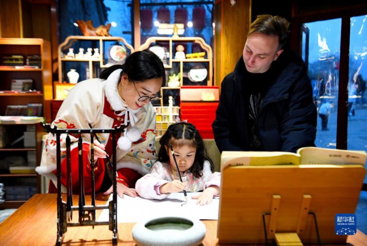 1月13日,在洛阳市洛邑古城一家文创店内,乔丹与妻子范梦佳教女儿艾润写毛笔字。 新华社记者 郝源 摄