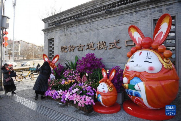 1月17日,游客在摆放着兔爷的石景山区模式口历史文化街区拍照。