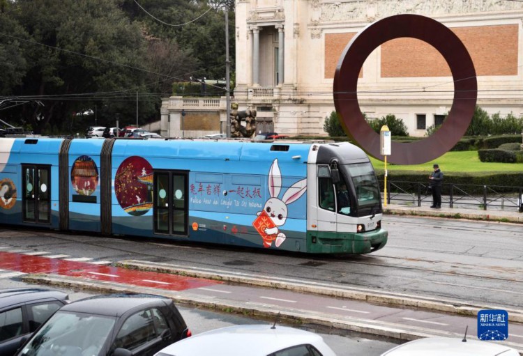 1月17日,兔年春节主题电车行驶在意大利罗马街头。 当日,兔年春节主题电车亮相意大利首都罗马,庆祝即将到来的中国农历新年。 新华社记者 金马梦妮 摄