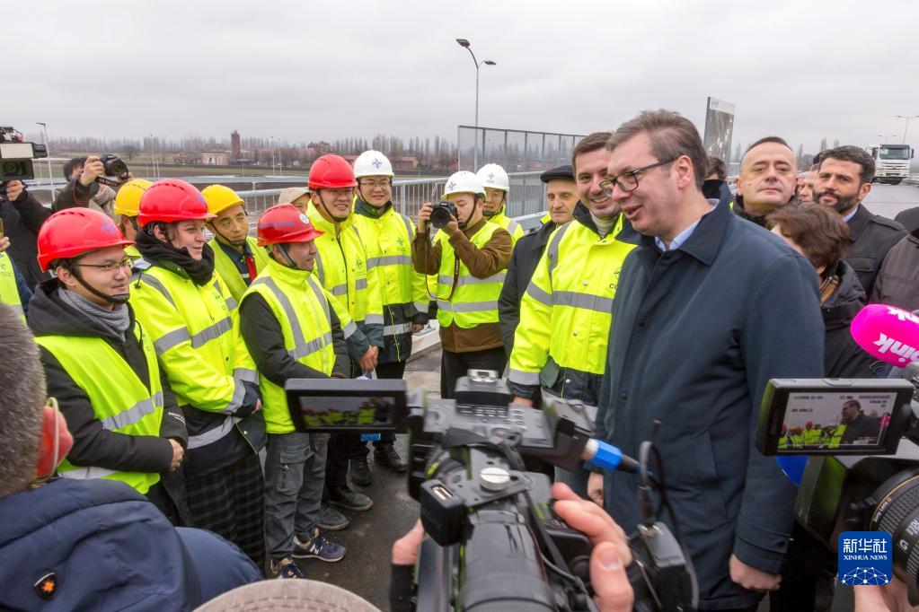 1月11日,塞尔维亚总统武契奇(右)在首都贝尔格莱德视察“新贝尔格莱德-苏尔钦”高速公路项目施工现场时与塞中两国建设者见面。
