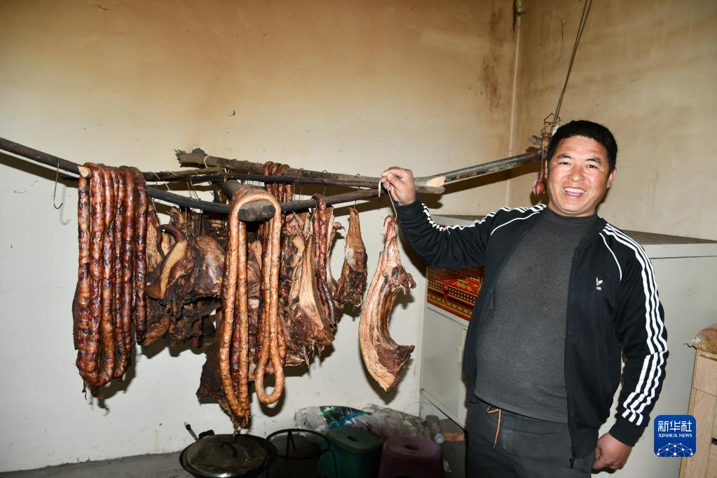 1月12日,巫其石且展示新做好的香肠腊肉。新华社记者 谢佼 摄