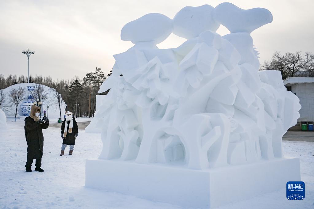 1月18日,在哈尔滨太阳岛雪博会园区,游客观赏参赛雪雕作品。 当日,在“冰城”哈尔滨市太阳岛雪博会园区举行的第二十九届全国雪雕比赛落幕。 新华社记者 谢剑飞 摄