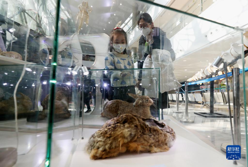 1月18日,参观者在一组兔类标本展品旁驻足观看。