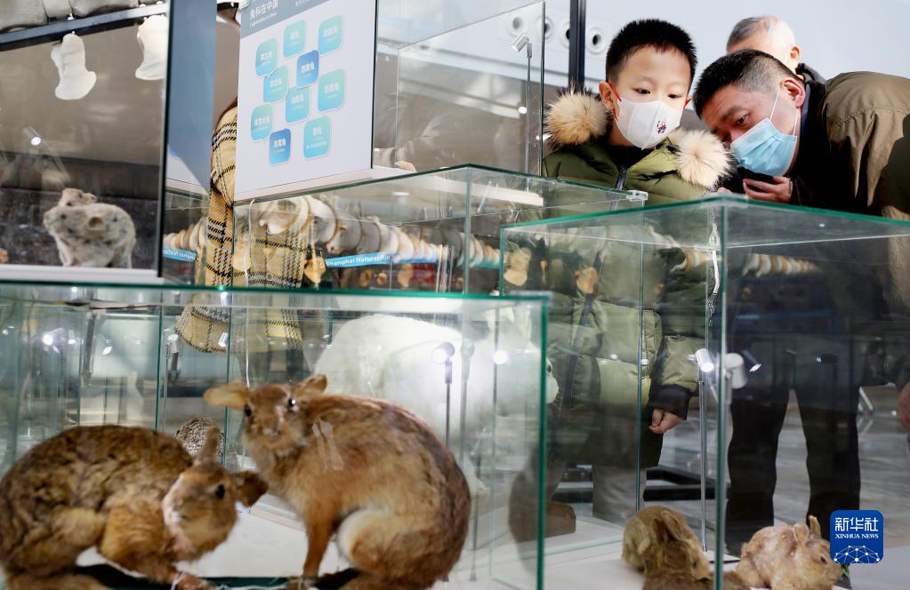 1月18日,参观者在一组兔类标本展品旁驻足观看。