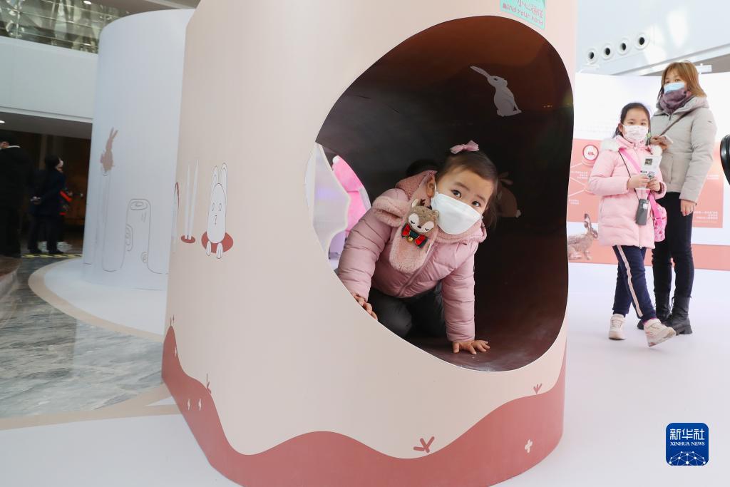 1月18日,一位小朋友(左)在展览上体验模拟兔子洞的游戏互动展品。