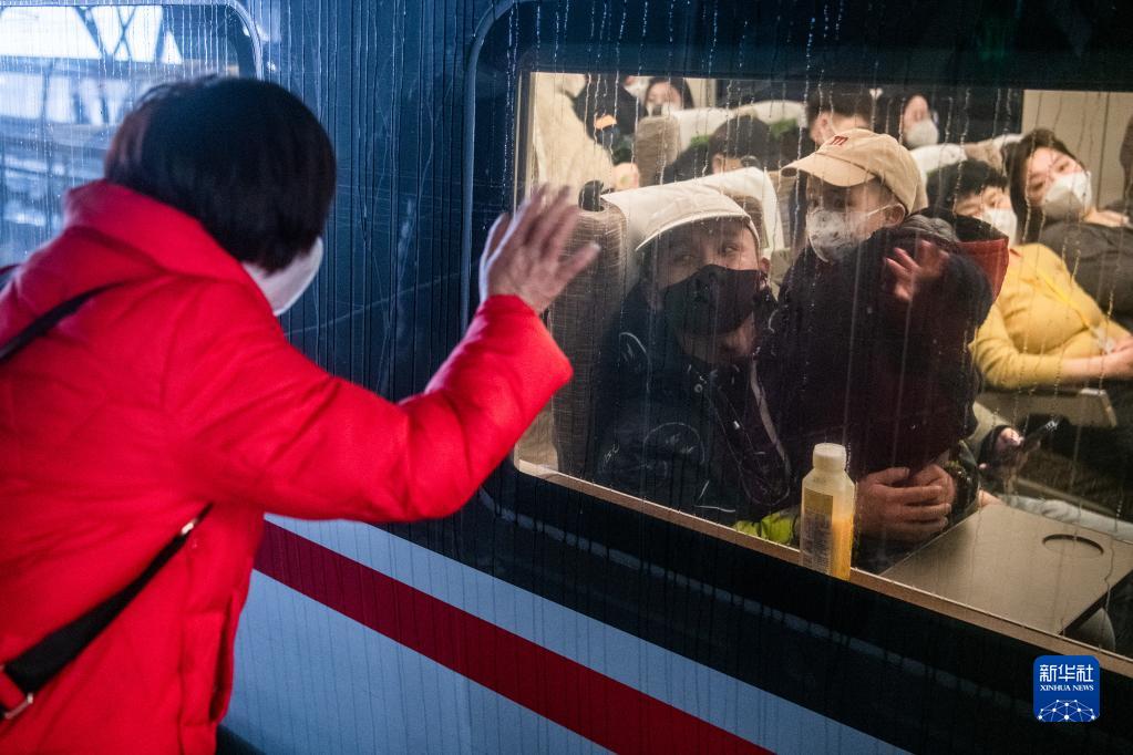 2023年1月7日,在武汉站站台,旅客与亲人告别。当日,2023年春运启动。新华社记者 伍志尊 摄