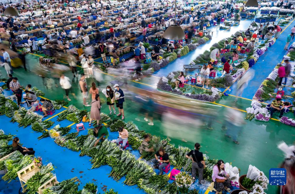 2022年7月12日,游客在夜间游览云南昆明斗南花卉交易市场并选购鲜花。新华社记者 陈欣波 摄