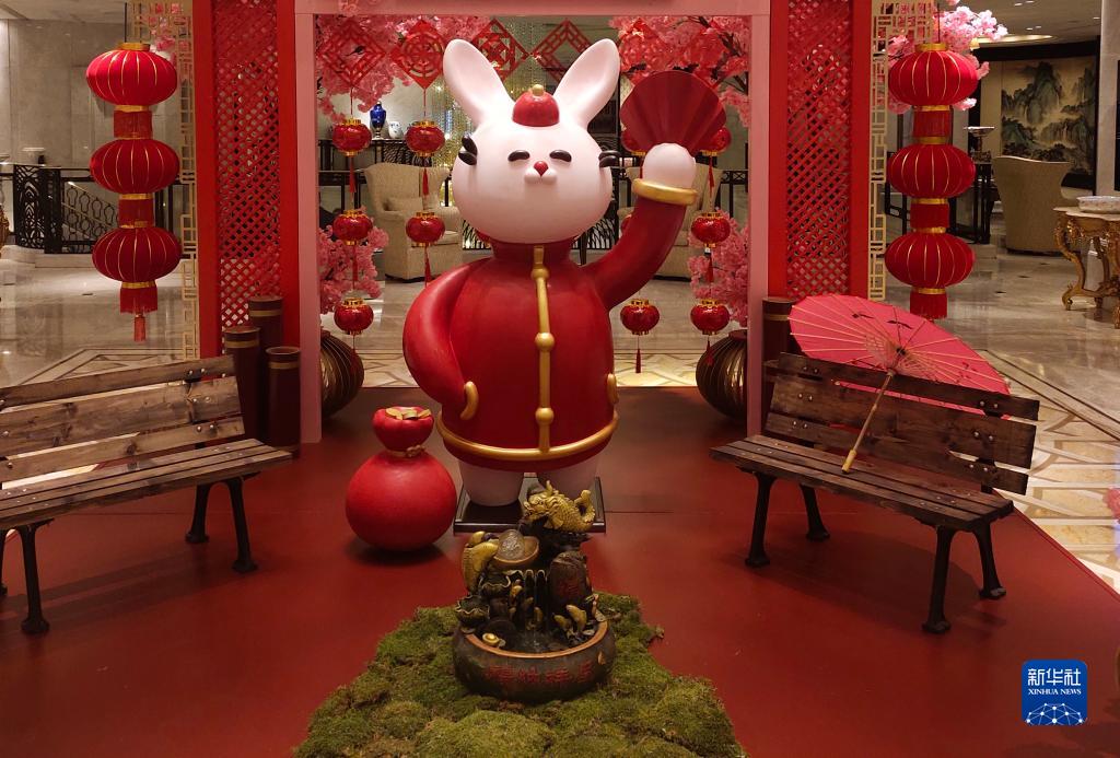 这是1月17日在土耳其最大城市伊斯坦布尔一家酒店大厅拍摄的兔年装饰。