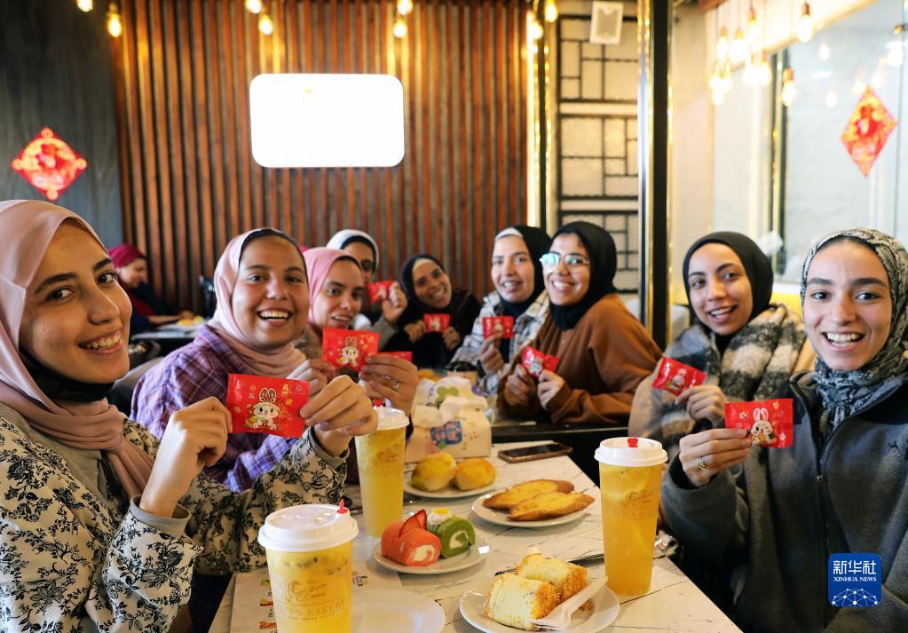 1月18日,顾客在位于埃及首都开罗的一家烘焙坊内感受中国春节氛围。临近中国农历春节,这家烘焙坊推出兔年春节主题装饰与商品,增添节日气氛、吸引消费者。 新华社记者 王东震 摄