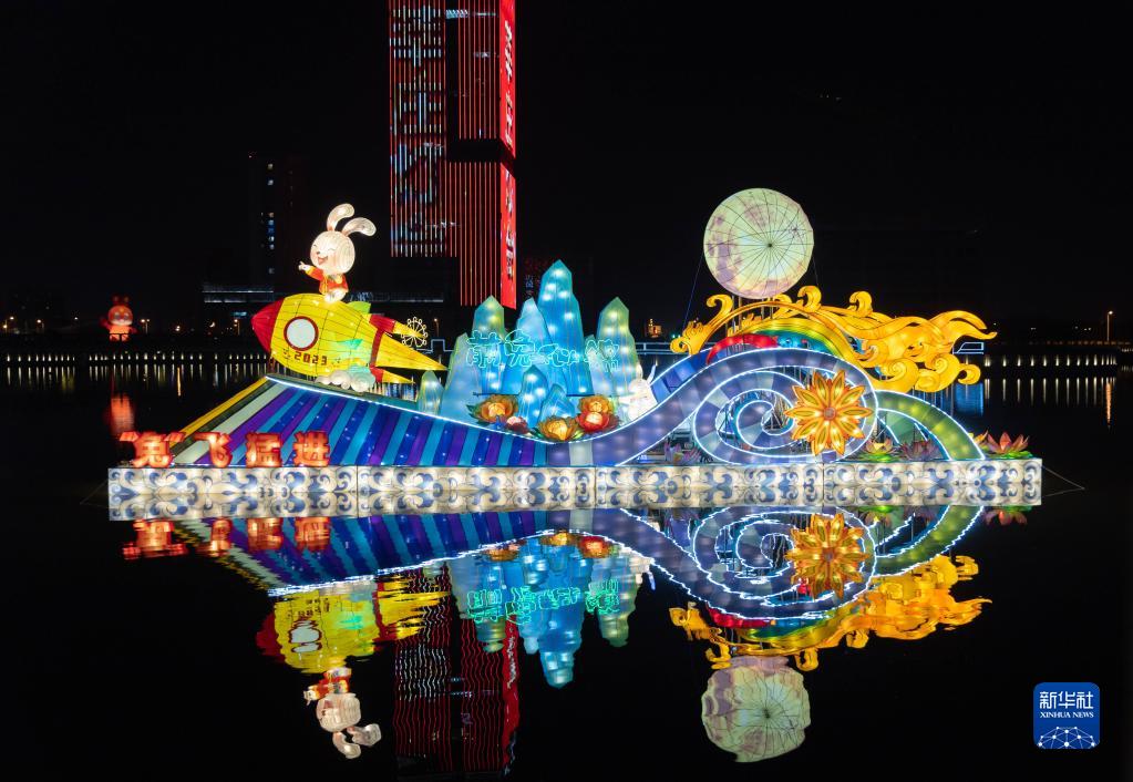 1月18日晚,2023癸卯兔年莘庄灯会在上海市闵行区莘庄镇莘庄商务区正式启幕。今年的莘庄灯会将从1月18日持续到2月6日,展出的大型灯组多数以兔子为设计原型,同时融入莘庄梅花、吉祥物“莘宝”等元素,众多市民前来赏灯游玩,感受新年氛围。
