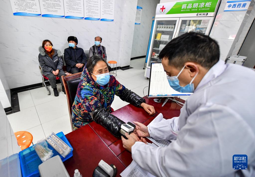 1月19日,北川县曲山镇任家坪村、石椅村联合卫生室村医赵太安(右一)在村卫生室为前来问诊的村民测量血压。