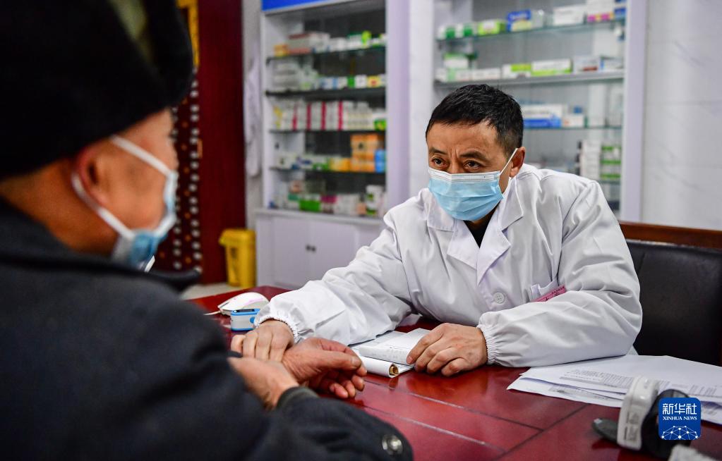 1月19日,北川县曲山镇任家坪村、石椅村联合卫生室村医赵太安在村卫生室为前来问诊的村民号脉。