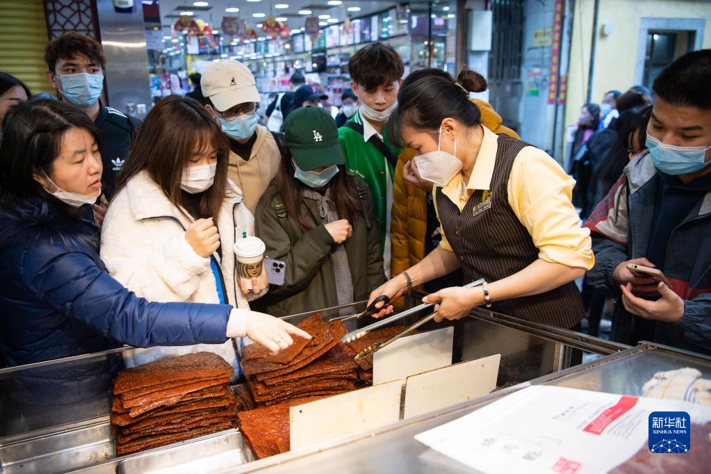 1月18日,游客在澳门大三巴牌坊前手信店选购肉脯。
