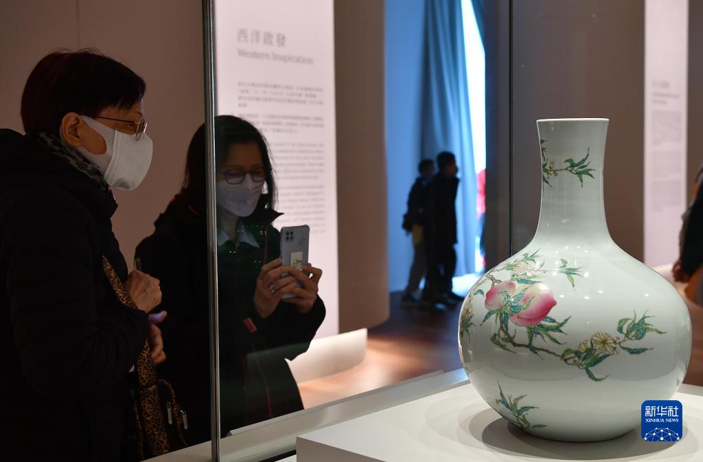 1月19日,观众在观看“粉彩九桃结树图天球瓶”。