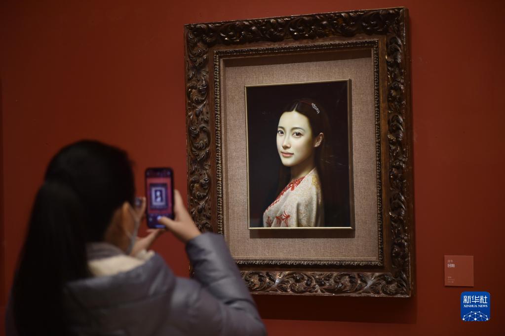 1月22日,参观者在中国美术馆拍摄“美在致广——全国小幅美术精品展”中的展出作品《回眸》。