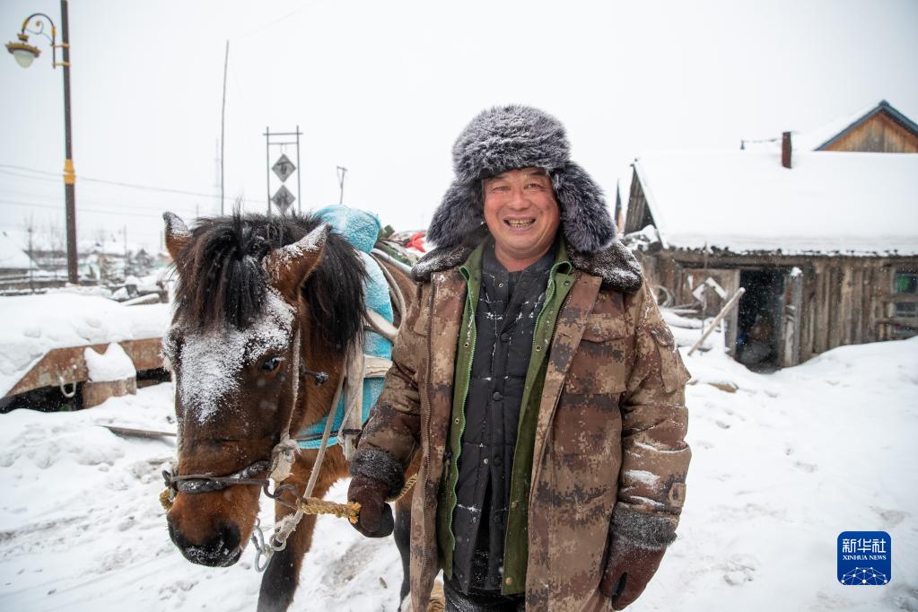 1月12日,在黑龙江省漠河市北红村内,脱贫户程金海结束当日马拉爬犁的工作。 新华社记者 张涛 摄