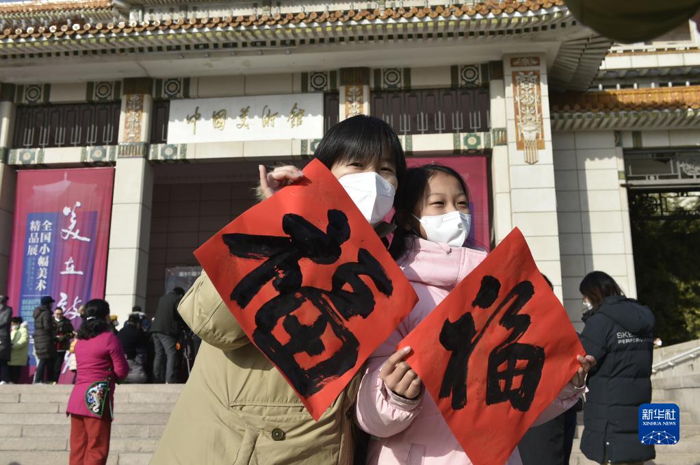 1月22日,观众在中国美术馆前广场展示刚领到的“福”字。 当日是大年初一,中国美术馆在前广场举行送“福”贺新春活动,邀请书法家现场为观众书写并赠送“福”字,共贺新春佳节。 新华社记者 鲁鹏 摄