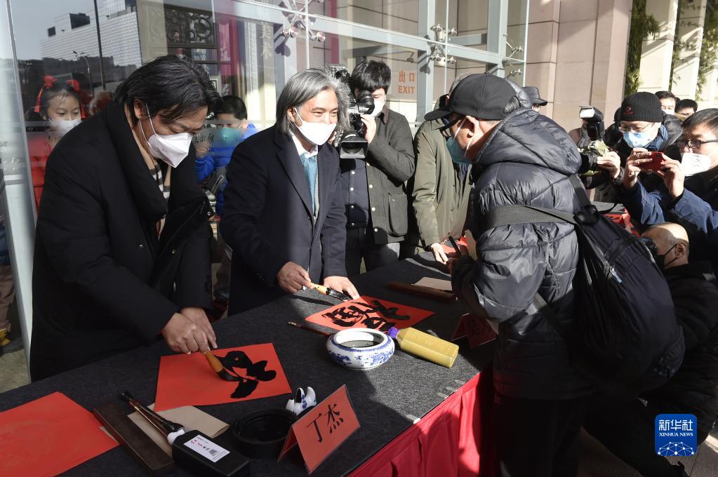 1月22日,中国美术馆馆长吴为山(左二)为观众现场书写并赠送“福”字。 当日是大年初一,中国美术馆在前广场举行送“福”贺新春活动,邀请书法家现场为观众书写并赠送“福”字,共贺新春佳节。 新华社记者 鲁鹏 摄