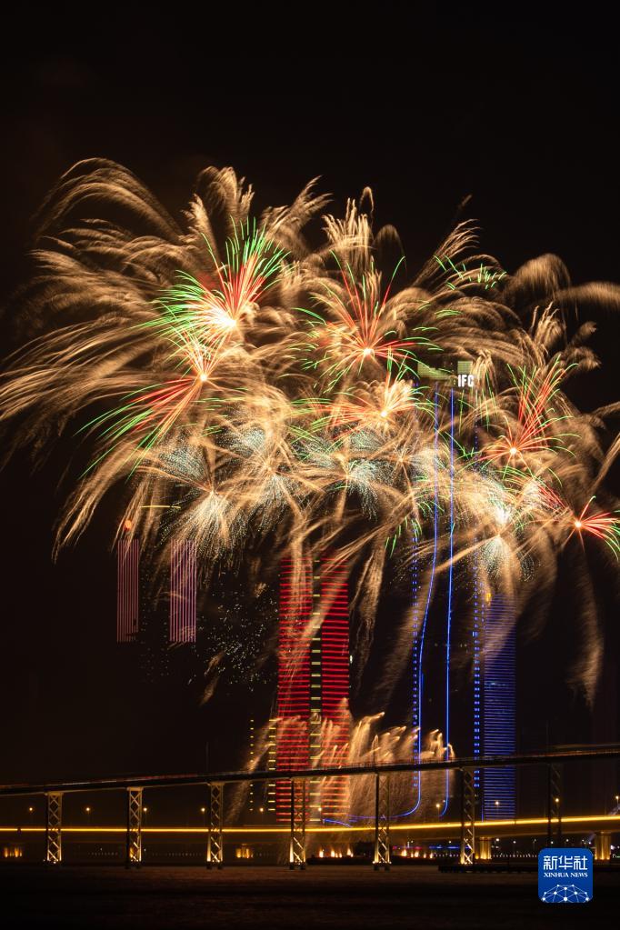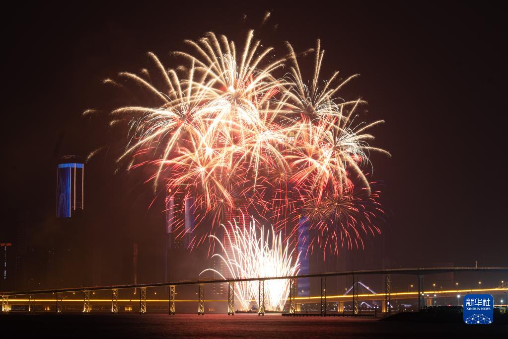 1月24日,澳门特区在旅游塔对开海面举办贺岁烟花汇演。新华社记者 张金加 摄