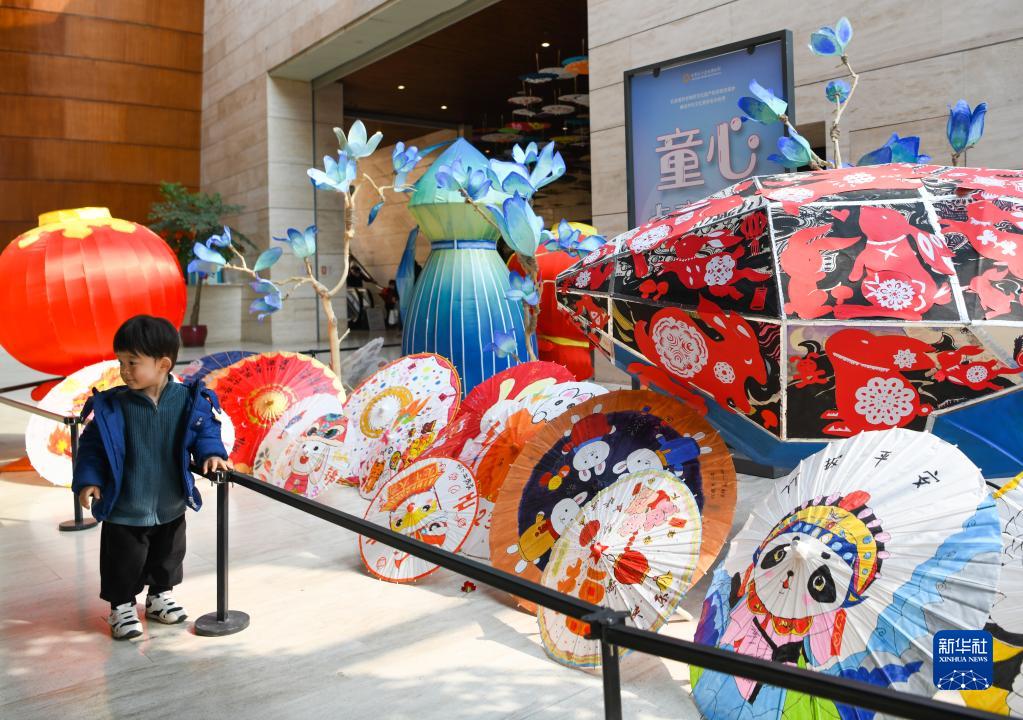 1月24日,在四川成都的金沙遗址博物馆,小朋友在“童心点亮金沙”校园非遗成果展前留影。