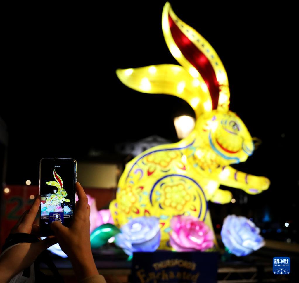 1月21日晚,游客在英国伦敦特拉法加广场拍摄兔子彩灯。 21日晚,伦敦特拉法加广场点亮兔子彩灯,纳尔逊纪念柱的柱身出现“恭贺新禧2023”字样,迎接中国农历新年。 新华社记者 李颖 摄