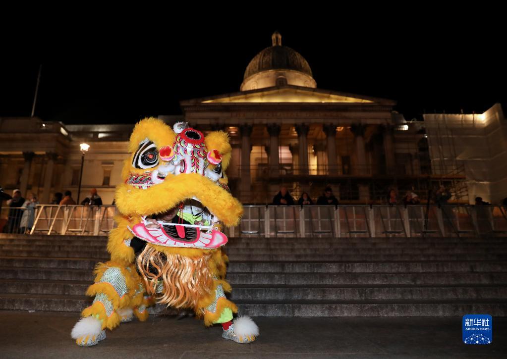 1月21日晚,演员在英国伦敦特拉法加广场表演舞狮。 21日晚,伦敦特拉法加广场点亮兔子彩灯,纳尔逊纪念柱的柱身出现“恭贺新禧2023”字样,迎接中国农历新年。 新华社记者 李颖 摄 |