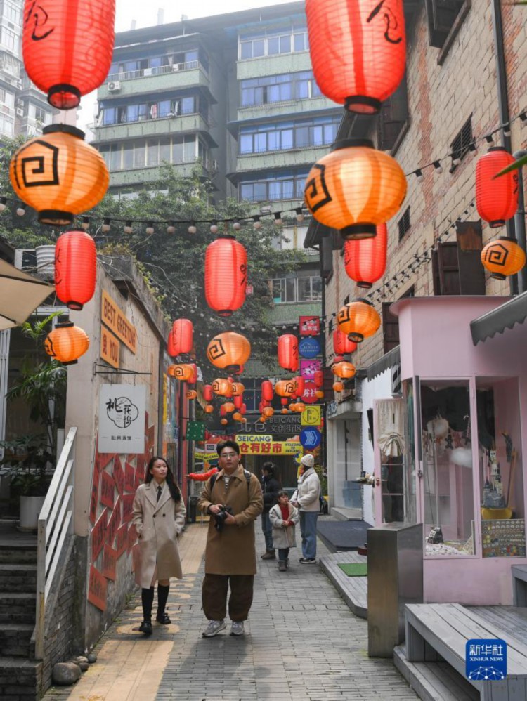 1月27日,游客在重庆北仓文创街区游览。 春节假期,重庆市江北区的北仓文创街区吸引不少市民和游客前来游览。该街区由重庆市江北纺织仓库老厂房改造而成,由城市公共图书馆、休闲商业区、文创办公区等构成。 新华社记者 王全超 摄