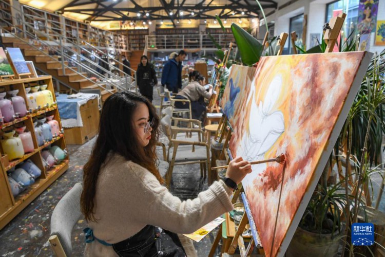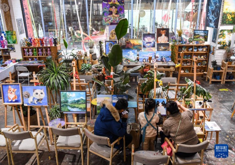 1月27日,游客在重庆北仓文创街区体验绘画。 春节假期,重庆市江北区的北仓文创街区吸引不少市民和游客前来游览。该街区由重庆市江北纺织仓库老厂房改造而成,由城市公共图书馆、休闲商业区、文创办公区等构成。 新华社记者 王全超 摄