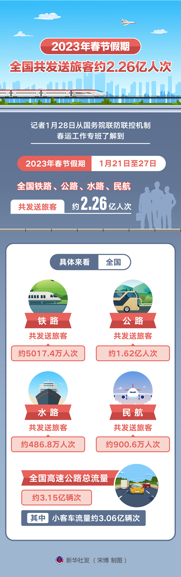 新华社北京1月28日电(记者叶昊鸣、樊曦)记者28日从国务院联防联控机制春运工作专班了解到,2023年春节假期(1月21日至27日),全国铁路、公路、水路、民航共发送旅客约2.26亿人次。