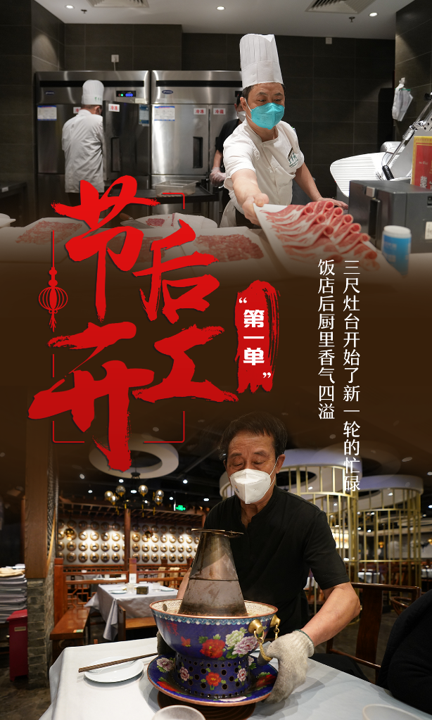 10点50分,北京东来顺饭庄总店迎来了节后开工的第一桌客人,20岁的服务员王欣彤赶忙将客人迎进店内。她说,这个春节是她工作以来经历过最热闹、也是最累的七天。“虽然累点,但我们的工资和奖金也提高了。”