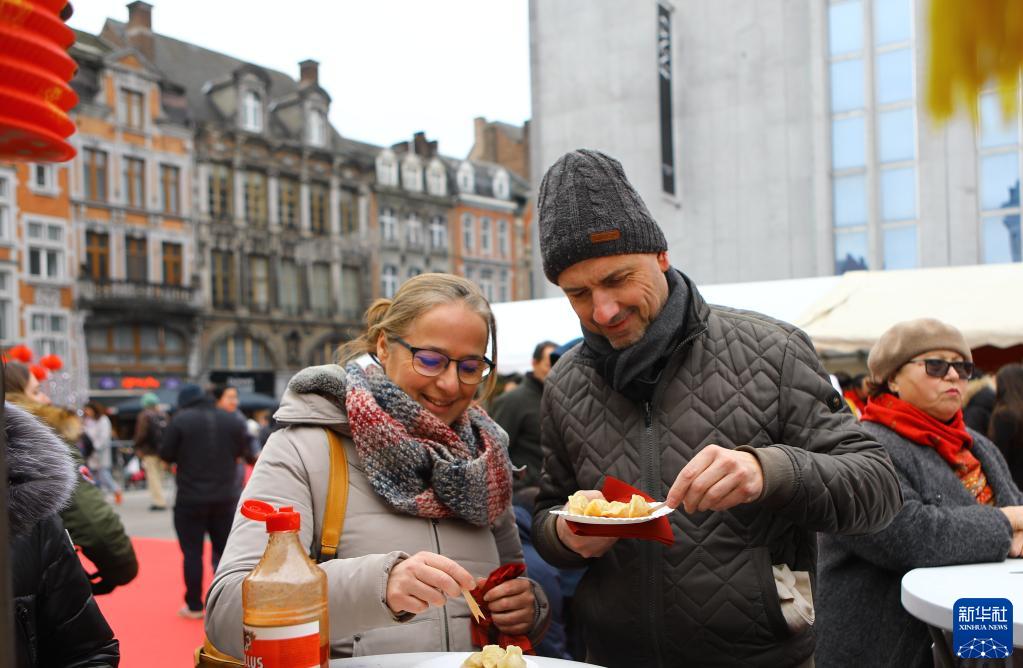 1月28日,人们在比利时纳慕尔品尝中式小吃。 当日,比利时纳慕尔市举办“中国春节游园庙会”活动。 新华社记者 潘革平 摄