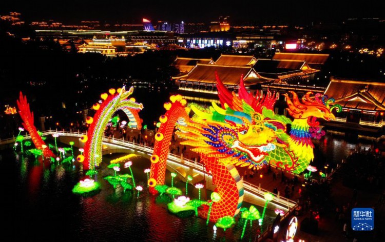 这是1月24日在西安大唐芙蓉园拍摄的花灯(无人机照片)。 连日来,西安城墙、大唐芙蓉园、大唐不夜城等景区花灯璀璨,街头流光溢彩,古都历史与现实交相辉映,绽放魅力。 新华社记者 刘潇 摄