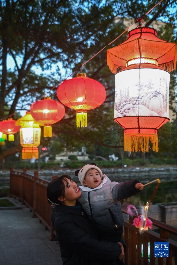 1月29日,在嘉兴市秀洲区新塍古镇小蓬莱公园内,一位家长带着孩子在观赏“鳌山灯会”的彩灯。