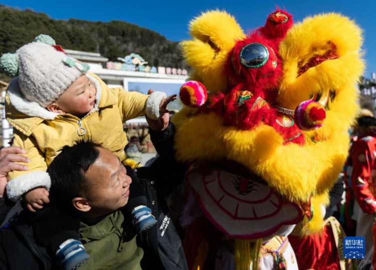 1月30日,巡游队伍在表演舞狮。 当日,在夹金山山脚下,四川省雅安市宝兴县硗碛藏族乡的藏族群众身着盛装,庆祝一年一度的“上九节”。近年来,民俗旅游接待成为当地支柱产业,“上九节”已成为当地推介民俗旅游的一张闪亮名片。 新华社记者 江宏景 摄
