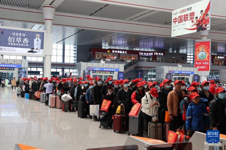 1月30日,D2879次务工专列旅客在贵阳北站排队乘车。 当日,D2879次务工专列从贵阳北站发车。这是2023年贵阳开出的首趟高铁务工专列,搭载600余名外出务工人员南下就业。据了解,该趟务工专列由贵州省黔南州、广东省广州市的人社部门根据务工人员返岗需求定制加开。 新华社记者 刘续 摄
