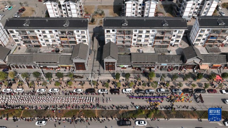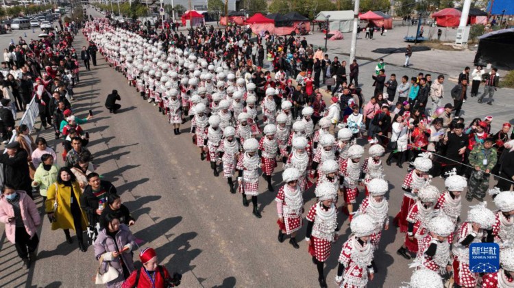 1月31日,苗族同胞在贵州省黔东南苗族侗族自治州黄平县谷陇镇盛装巡游(无人机照片)。 当日,在贵州省黄平县谷陇镇,26个村(居)的千余名苗族同胞身着银饰盛装,跳板凳舞、吹芦笙、唱苗歌,载歌载舞喜迎元宵佳节。 新华社发(潘锋摄)