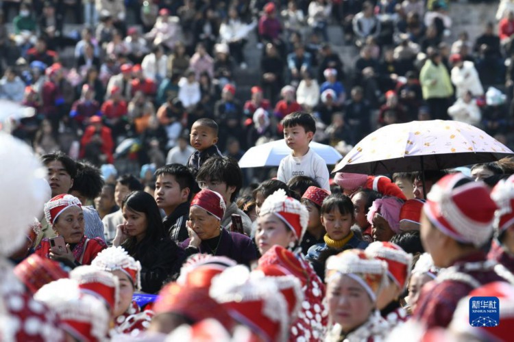 1月31日,苗族同胞在贵州省黔东南苗族侗族自治州黄平县谷陇镇观看文艺演出。 当日,在贵州省黄平县谷陇镇,26个村(居)的千余名苗族同胞身着银饰盛装,跳板凳舞、吹芦笙、唱苗歌,载歌载舞喜迎元宵佳节。 新华社记者 杨楹 摄