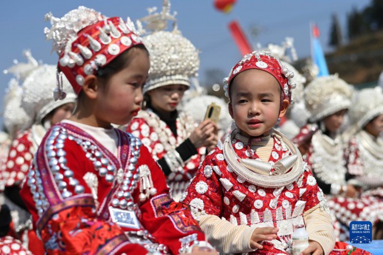 1月31日,苗族小朋友在贵州省黔东南苗族侗族自治州黄平县谷陇镇观看文艺演出。 当日,在贵州省黄平县谷陇镇,26个村(居)的千余名苗族同胞身着银饰盛装,跳板凳舞、吹芦笙、唱苗歌,载歌载舞喜迎元宵佳节。 新华社记者 杨楹 摄