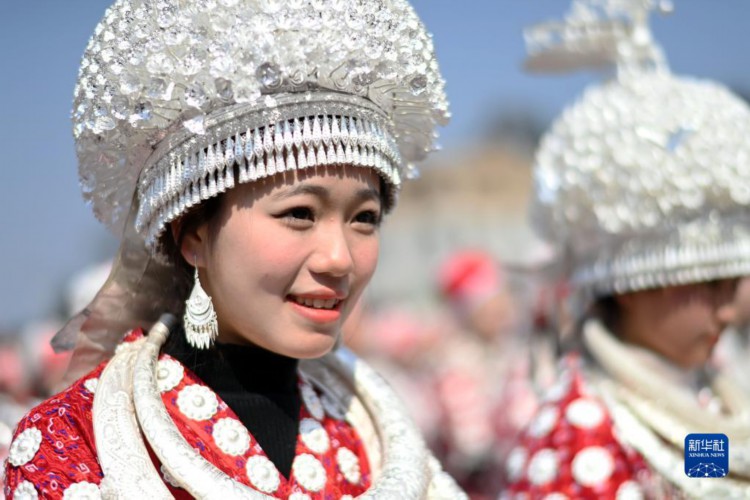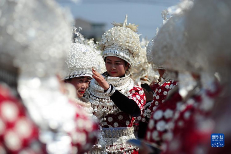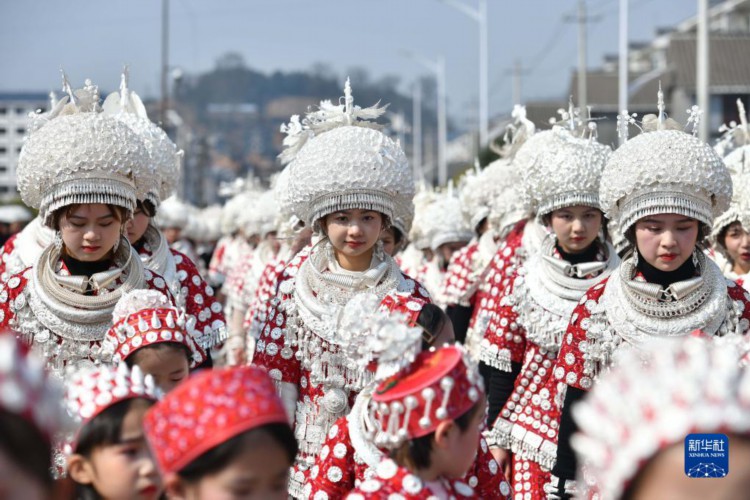 1月31日,苗族同胞在贵州省黔东南苗族侗族自治州黄平县谷陇镇盛装巡游。 当日,在贵州省黄平县谷陇镇,26个村(居)的千余名苗族同胞身着银饰盛装,跳板凳舞、吹芦笙、唱苗歌,载歌载舞喜迎元宵佳节。 新华社发(梁文摄)
