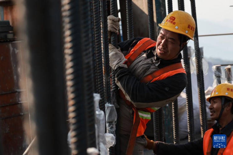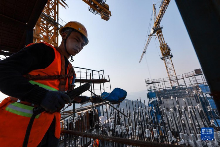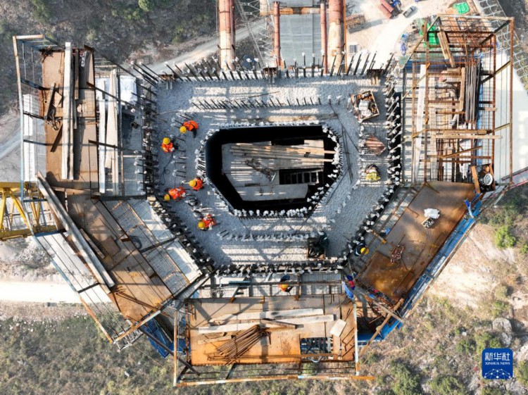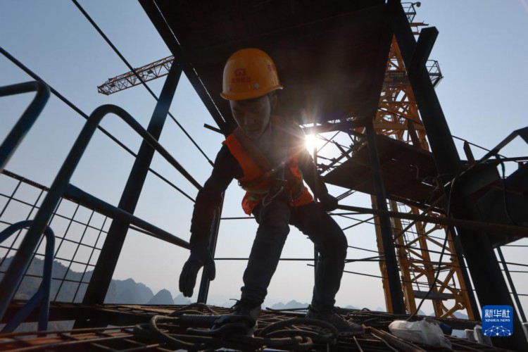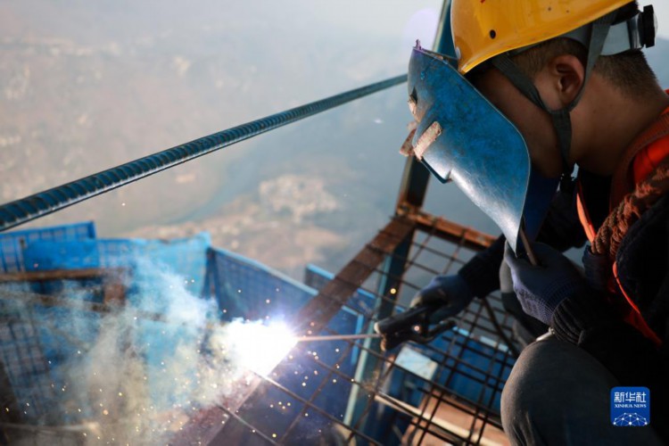 2月1日,施工人员在花江峡谷大桥主塔上施工。 新春伊始,贵州花江峡谷大桥建设现场一派繁忙。花江峡谷大桥是六安高速公路的控制性工程之一,建成后主桥桥面与谷底的北盘江距离达625米,预计2025年竣工。 新华社记者 欧东衢 摄