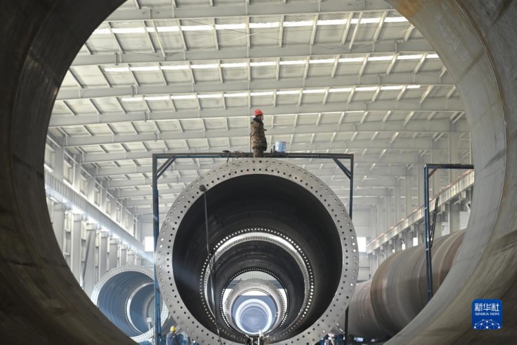 2月2日,在张掖市高台县的一家风机塔筒企业,工人在生产线上作业。 春节假期过后,甘肃省张掖市的各类企业开足马力抓生产,加紧完成产品订单。 新华社记者 范培珅 摄