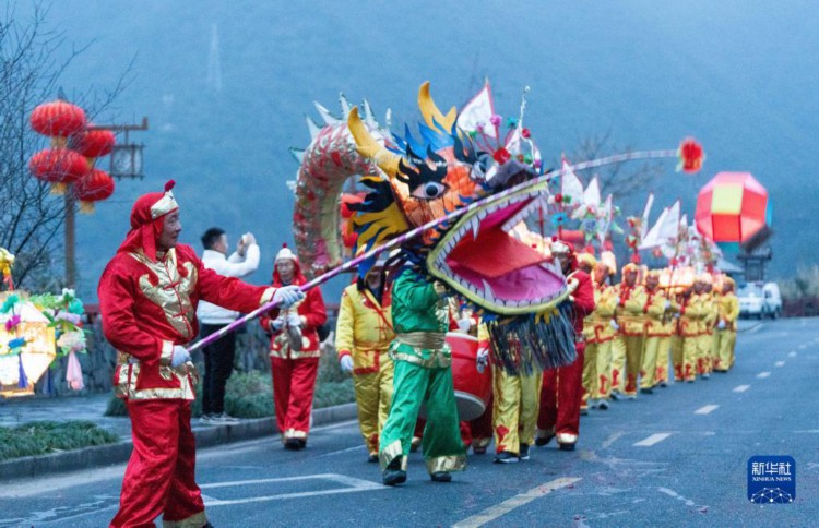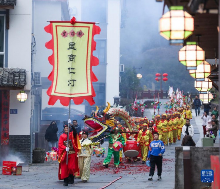 2月2日,浙江省杭州市淳安县里商乡的村民参加里商仁灯元宵巡游。 当日,浙江省杭州市淳安县里商乡举行2023元宵节花灯巡游,为当地山乡增添了热闹的元宵氛围。 作为浙江省非物质文化遗产的里商仁灯有500多年的历史,做工精巧、图案逼真。近年来,杭州市淳安县里商乡立足发展非遗旅游项目,建设非遗产业园,将里商仁灯制作、表演等开发为当地特色的体验性旅游项目,助力乡村旅游。 新华社记者 徐昱 摄